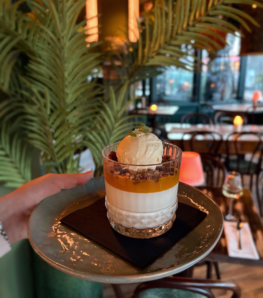 crumble, passievrucht ijs en chocoladesaus